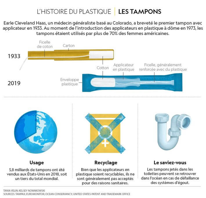 Les protections hygiéniques les plus courantes contiennent beaucoup de plastiques. Les tampons sont emballés dans du plastique, encapsulés dans des applicateurs en plastique, avec des ficelles en plastique, et la plupart d'entre eux incluent même une fine pellicule de plastique dans la partie absorbante. Les serviettes contiennent généralement encore plus de plastique, de la base étanche aux produits synthétiques qui absorbent le fluide jusque dans l’emballage (polypropylène ou polyéthylène mince).