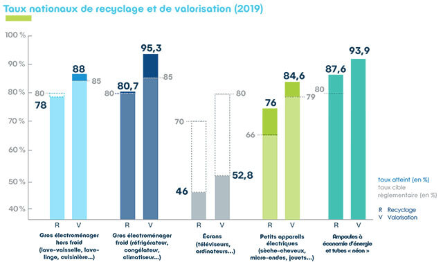 Lorsque les équipements sont recyclés, le taux de recyclage des DEEE oscille entre 74 % et 86 %.