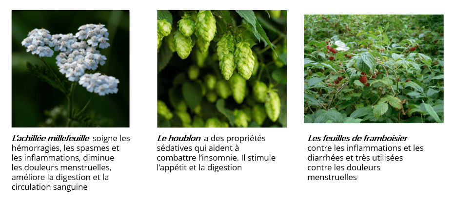 - Infusion de verveine, d’achillée millefeuilles, d’orties blanches, de camomille, de tilleul, de romarin et/ou de feuilles de framboisier parmis les plantes les plus fréquemment utilisées, à boire quelques jours avant et pendant les règles à raison d’un litre par jour (environ 15-20 g de plante sèche par litre). Il est également possible d’utiliser la sauge officinale, mais cette plante ne peut être utilisée en cas d’antécédents médicaux liés au système endocrinien (SOPK, cancer du sein, …). La proportion des plantes que vous utilisez dépend de l’effet recherché : antispasmodique, anti-douleur, légère diminution du flux sanguin, anti-inflammatoire …