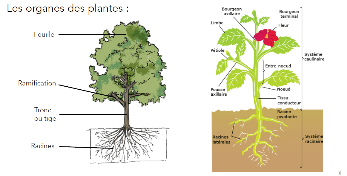 D’abord, qu’est-ce qu’une plante ? Une plante est un organisme photosynthétique terrestre. A ce jour, il existe 400 000 espèces de plantes, et pour cet atelier nous nous sommes concentré.es sur les fougères, les gymnospermes et les angiospermes. Une plante est composé d’un tronc ou tige qui sert à s’ancrer dans le sol et lui apporter les minéraux, de ramifications (branches) avec des feuilles qui vont permettre à la plante de faire de la photosynthèse (produire des composés sucrés qu’elle ne peut pas puiser dans le sol). Les ramifications et les feuilles sont implanté dans des noeuds.