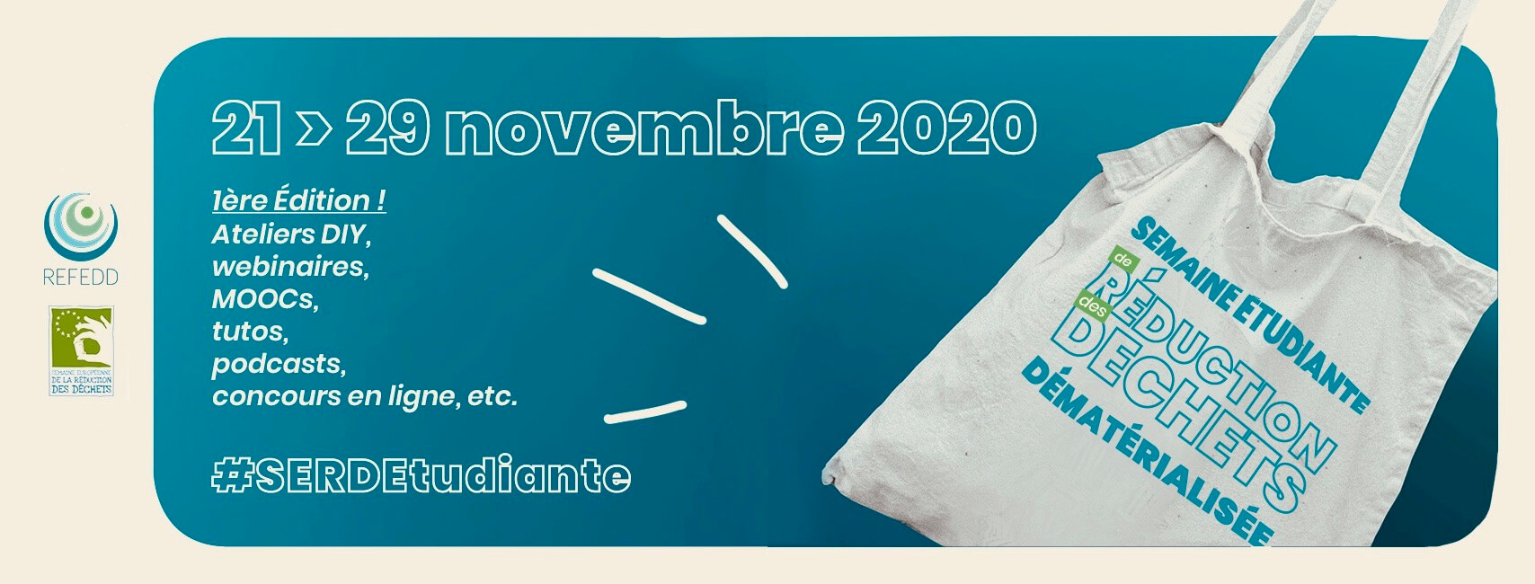 C’est pourquoi, cette année, le REFEDD a décidé de lancer, en partenariat avec l’ADEME, l’Agence de la Transition Écologique, la première édition de la Semaine Étudiante de Réduction des Déchets ! Depuis plusieurs années, le REFEDD et ses partenaires participent à la Semaine Européenne de la Réduction des Déchets (SERD), à travers les opérations Zéro mégot et Zéro bouteille en plastique sur les campus. Cette semaine est une initiative européenne qui aura lieu du 21 au 28 novembre 2020 et vise à sensibiliser le plus grand nombre à l’impact des déchets sur notre planète.